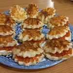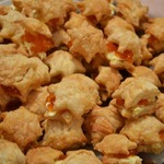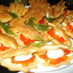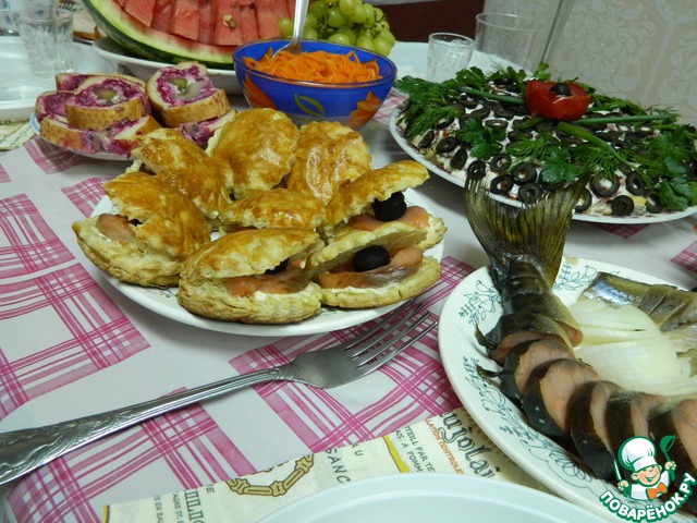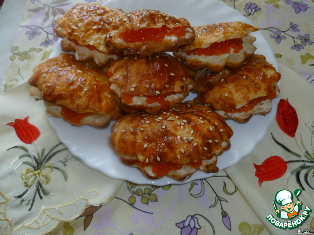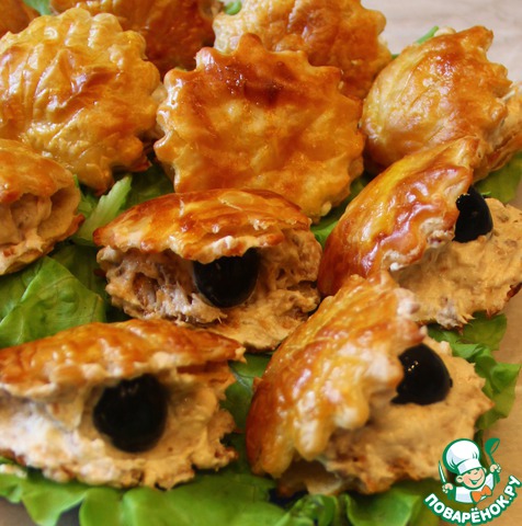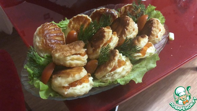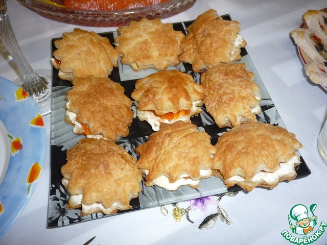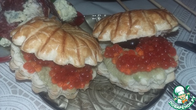 Яркие и праздничные тарталетки с рыбной начинкой и съедобными жемчужинами в ракушках из слоеного теста. На конкурс "Королева фуршета".