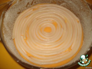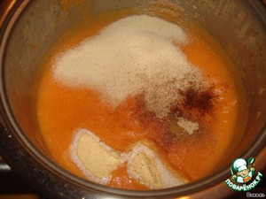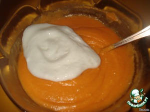 Когда тыквенное пюре остыло, добавляем к нему сахар, желтки и в последнюю очередь - взбитые в крепкую пену белки.