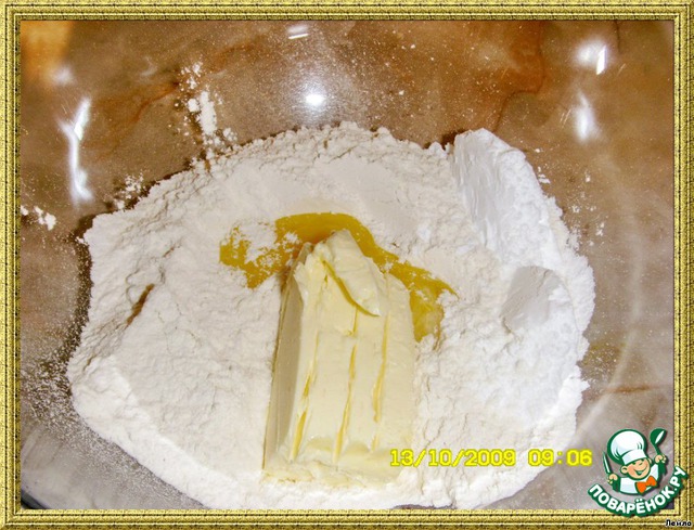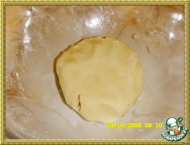 Быстро замесить тесто, добавить воды, если необходимо. Скатать шар, завернуть в пленку и охладить в течении 20 мин.