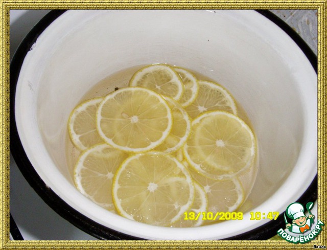 Добавить порезанные лимоны и варить на очень маленьком огне 40 мин. или до тех пор, пока кожура не станет прозрачной.