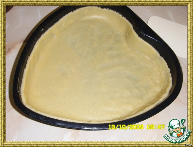 Нагреть духовку до 200°С. Форму для тарта (диаметром 21 см) со съемными бортами слегка смазать маслом. Раскатать тесто и выложить в форму. Обрезать излишки теста по краям. Охлаждать 10 мин. Печь в "слепую" около 10 мин. Вынуть из духовки, убрать фасоль или кер. шарики и бумагу и еще печь 6-8 мин. или до золотистого цвета, не пережарьте. Слегка охладить. Убавить жар в духовке до 150°С.