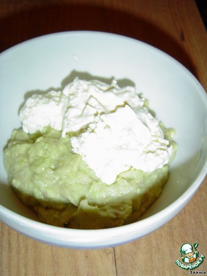 К полученной массе добавляем сливочный сыр и аккуратно перемешиваем.