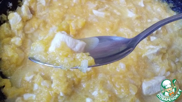 Луковицу нарезать полукольцами и слегка спассеровать в небольшом количестве растительного масла, добавить нарезанное куриное филе и припустить его до побеления со всех сторон (не зажаривать!!!)
