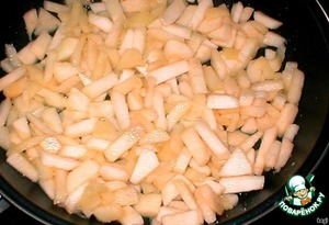 Яблоки помыть, обсушить, очистить и мелко нарезать. Посыпать сахаром, корицей и обжарить на сливочном масле до мягкости.
