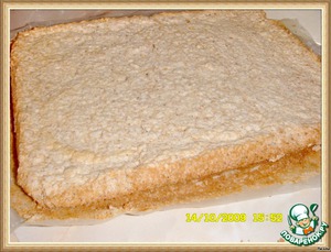 Разрезать корж ножом на 3 полосы 10х40 см (или по вашим меркам). Разрезала на 2 части. Промазать кремом, собрать и дать постоять в холодильнике несколько часов.