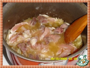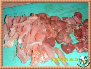 Разрезаем печень и вместе с сердечками и грудинкой