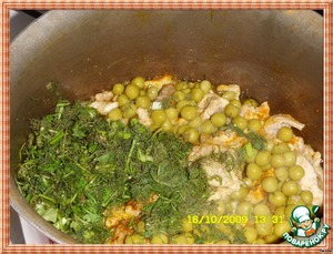 Добавляем остальные ингредиенты (зелень, горошек), кроме бульона, и жарим 3 мин.
