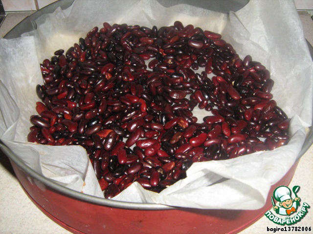 Затем форму выстилаем бумагой для выпечки, кладем бобовые для груза и ставим в разогретую до 200 градусов духовку на 15 минут.