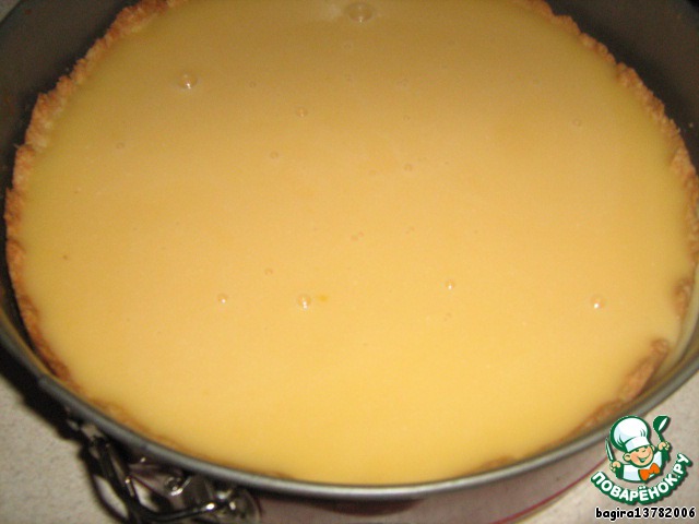 Выливаем на горячий корж начинку. Перед тем, как это сделать, начинку нужно процедить через ситечко, чтобы отделить цедру и неразмешанные кусочки белка.