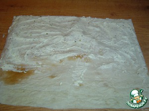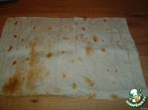 На готовый лаваш наносим творожный сыр (у меня был с чесноком и зеленью).