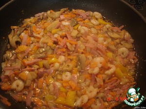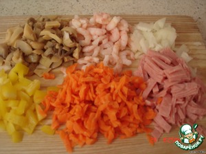 порезать лук,морковь,ветчину,перчик,креветки(если крупные),грибы