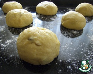 • Затем тесто разделить на 14-15 кусочков, скатать шарики и уложить их на противень на расстоянии примерно 1 см. Накрыть опять тканью и оставить на 1 час.