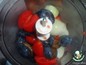 Помидоры, сливы (без косточек) и лук (очищенный естественно)перемолоть в блендере хорошо или перекрутить через мясорубку. Ставим на огонь иварим, периодически помешивая, около часа.
