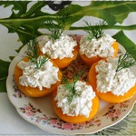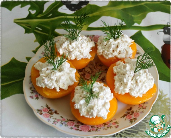 Половинки персиков наполняем приготовленным салатом, выкладываем на листья салата и украшаем зеленью!!!!! ПРИЯТНОГО АППЕТИТА!!!!!