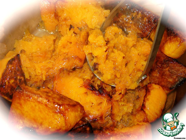 Тыкву разминаем в пюре. Не нужно пюрировать до кремообразного состояния. Пусть останется волокнистость или даже маленькие кусочки.