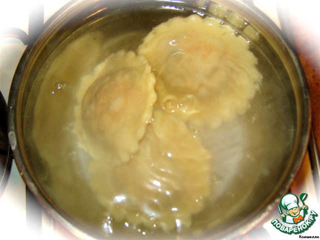 Варим равиоли, погружая по несколько штук в кипящую воду, до всплывания. Затем осторожно переворачиваем шумовкой и варим еще 5-7 мин. Все зависит от размеров ваших изделий.