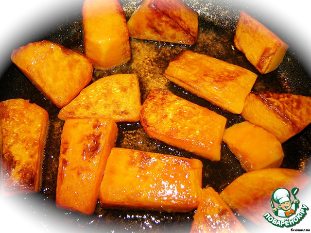 На сковороде разогреваем 2 ст. л. растительного масла (лучше оливкового) и отправляем туда тыкву. Жарим со всех сторон до появления коричневой корочки. При этом кусочки станут мягкими.