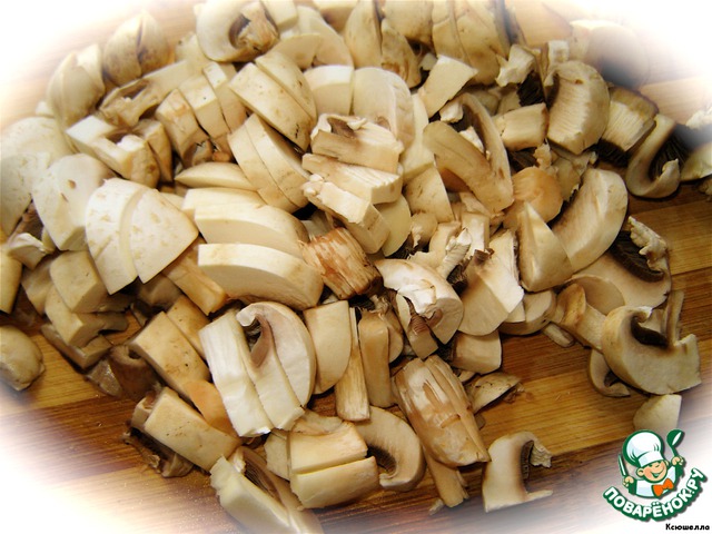 Грибы (у меня были шампиньоны, но вкусно и с вешенками или с тем и другим сразу) моем, режем пополам и нарезаем пластинками (не очень тонко). Если у вас вешенки, просто нарежьте кусочками. Поджариваем с 2 ст. л. растительного масла в отдельной сковороде и перед готовностью добавляем мелко рубленный чеснок и сливочное масло. Перемешиваем и снимаем с огня.