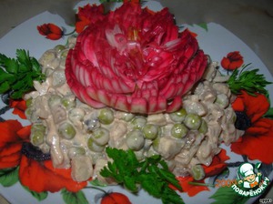 Соединить лук, горошек, селедку, заправить соусом из майонеза и кетчупа, поперчить.