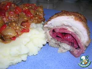 1. Окорочка освободить от костей, не нарушая целосность мяса, филе отбить, посолить, поперчить по вкусу. Положить на мясо кусочки сыра, колбасу и ягоды вишни без косточек.