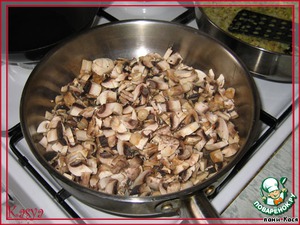 Грибы режем, обжариваем (я обжариваю практически на сухой сковородке, грибы дают жидкость - так вот до выпаривания этой жидкости)