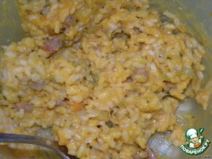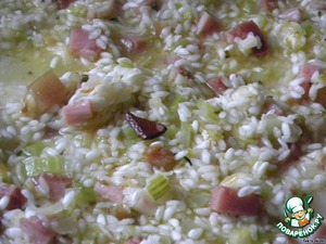 Добавляем рис, хорошо перемешиваем и постепенно вводим бульон, при этом постоянно помешиваем.