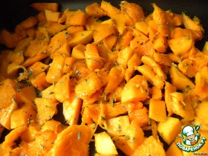 Мякоть тыквы вырезаем, режем на кусочки, смешиваем со смесью из соли, перца и орегано, выкладываем на противень, сбрызгиваем оливковым маслом и запекаем в духовке 35 минут. Затем взбиваем блендером в пюре.