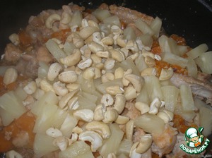 Добавить ананасы, орехи и карри. Посолить по вкусу, перемешать и готовить еще 7-10 минут.