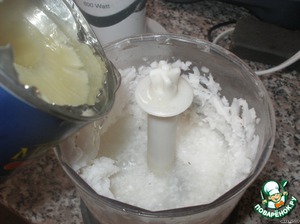 Кокос расколоть. Сок из кокоса и мякоть (примерно 50 гр - 1/3-1/4 от всей мякоти) поместить в чашу процессора, добавить сок от консервированных ананасов и взбить.