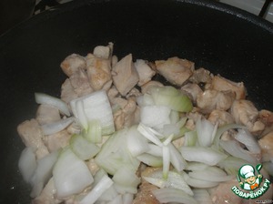 На раскаленной сковороде с добавлением растительного масла обжарить кусочки куриного филе 3-4 минуты.