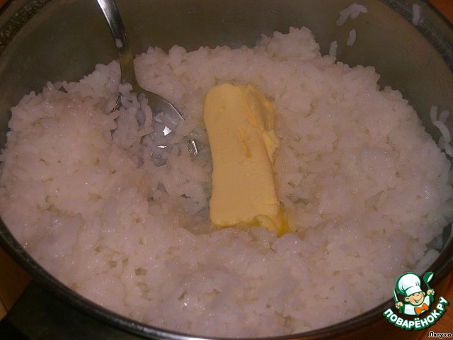 В отварной рис кладем сливочное масло.