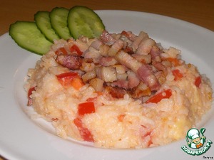 • Выкладываем на тарелку рис - кольцом, в центре делаем углубление, куда выкладываем поджаренную грудинку.