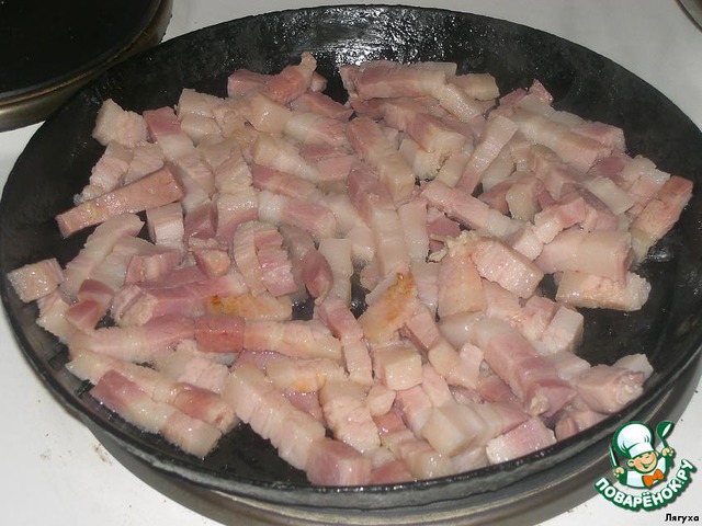 • Нарезаем грудинку кусочками.