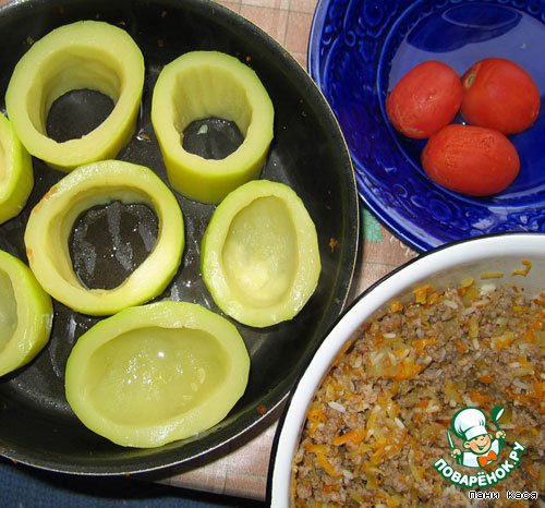 Разместить кабачки в форме. Приготовить фарш как для перцев - отварить рис до полуготовности, мясной фарш обжарить и луком и морковкой, добавить зелень, смешать, посолить, поперчить.
