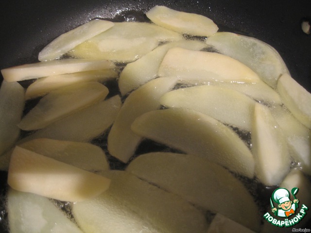 Картофель очистить, нарезать и пожарить в разогретом масле на высоком огне до золотистой корочки.