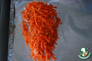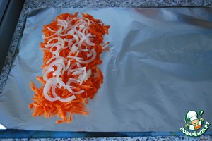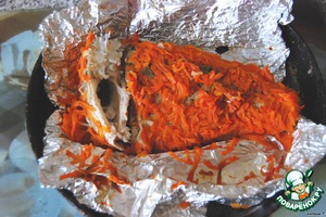 Берем лист фольги (такого размера, чтоб хватило завернуть рыбу 3 раза), выкладываем на неё половину тертой моркови, сверху половину лука.