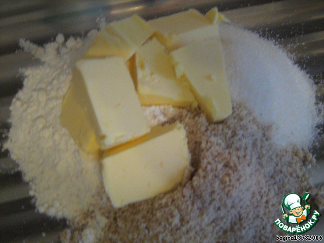 Замешиваем тесто: замороженное масло порубим ножом или в комбайне с мукой, сахаром и миндалем до крупной крошки.