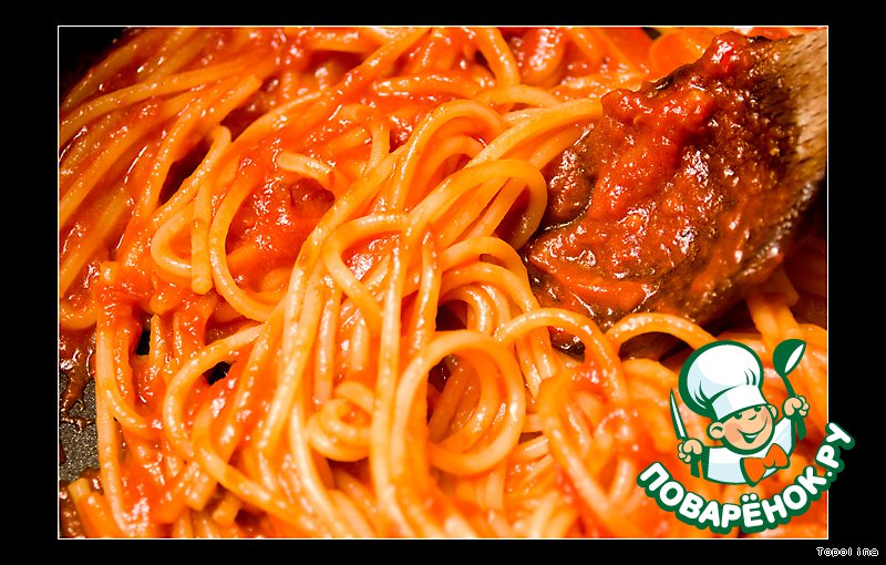 Тем временем отвариваем "на зуб" спагетти, сливаем воду и вываливаем наши макарошки к готовому злобному соусу, перемешиваем хорошенько и разогреваем на живеньком таком огоньке.