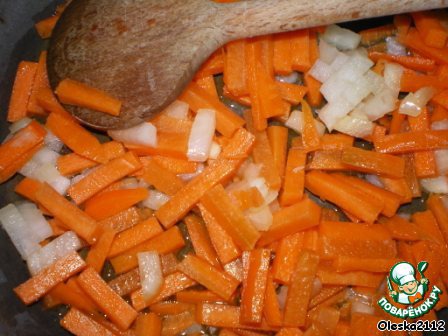 Готовим поджарку. Её состав: лук, морковь пассеруем на смеси растительного масла и сливочного масла, добавляем томат.