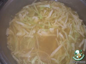 В готовый бульон кладём капусту, нарезанную соломкой. Варим до мягкости.
