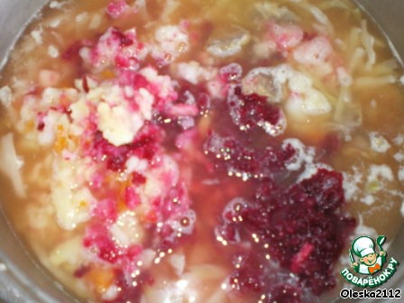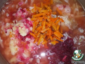 Мясо варим с 2 очищенными луковицами и 1 тоненькой морковкой. Периодически снимаем пену. Когда бульон почти готов, кладём резанную половинками свеклу и варим, пока она не побелеет. Перед готовностью свеклы в кастрюлю положить 2-3 целые картофелины.