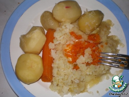 По мере готовности овощей вынимаем их шумовкой из бульона. Лук, морковь, картофель, свекла. Всё на тарелочке разминается вилкой.