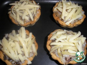 Итак, продолжаем… Сыр трем на крупной терке. Выкладываем в тарталетки по 1 ст. ложке начинки, посыпаем сыром и ставим в духовку на пару минут, чтобы сыр расплавился.