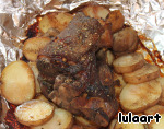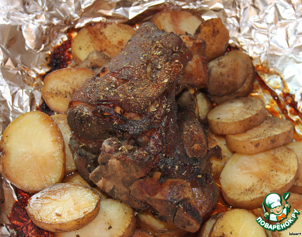 Старательно нашпиговали, теперь кладем рульку в фольгу, вокруг раскладываем порезанный дольками картофель. Можно сверху присолить и приперчить. И отправляем в духовку. Спустя примерно час мы разворачиваем фольгу, аккуратно поливаем мясо растопленным медом – примерно 1 -2 столовых ложки и можно потом присыпать душистыми травами на ваш вкус – я люблю травы. Теперь уже дело вашей выдержки, если ароматы еще не заставляют скручиваться в спираль ваш желудок, то пусть еще потомится в духовке. Мы обычно не выдерживаем и достаем спустя минут 10 – 15 после того, как полили медом. Вообще в первоначальном рецепте «Вепрево колено» нет меда, но вот в рульке по-мюнхенски есть. И мы так привыкли, что не можем отказать себе в удовольствие чувствовать этот сладковатый медовый вкус и аромат. Вот такой получается сборный рецептик, но ооочень вкусный. Люблю я даже сам процесс приготовления этого блюда, особенно шпиговать. Пока придумаешь, где бы еще сделать дырочку и как побольше туда насовать))))