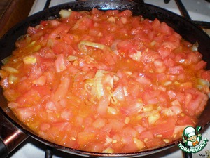 С помидор снять кожицу, мелко порезать и добавить к луку. Посолить, накрыть сковороду крышкой и тушить 10 минут.
