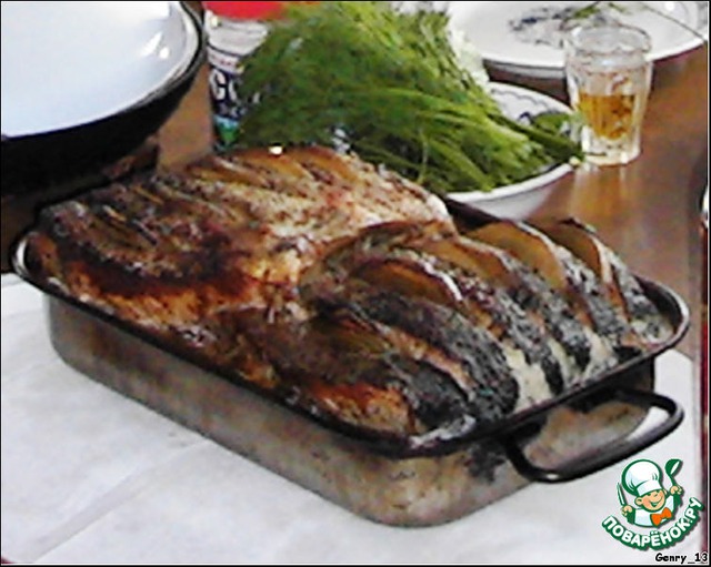 .. в красную рыбу, особенно в кету и горбушу, в надрезы укладывают ломтики солёного сала, не помешает это и сёмге. -