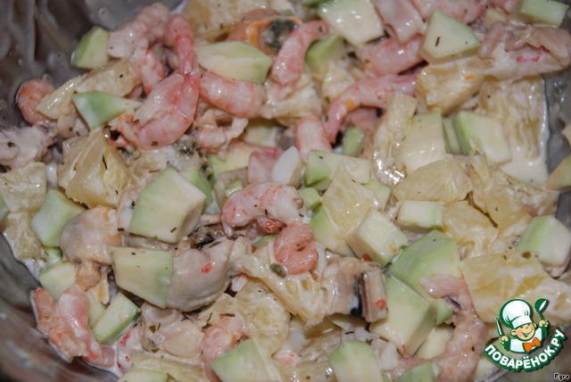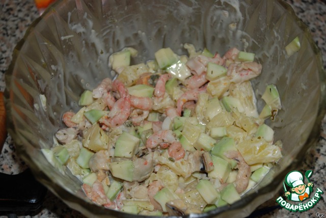 Соединяем с нашим авокадо и коктейлем. Заправляем немного майонезом.