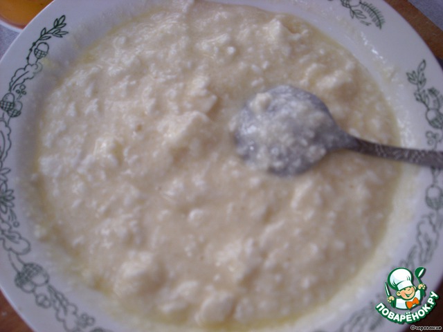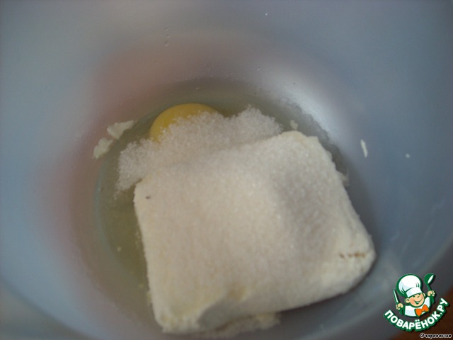 Тесто: творог растереть с сахаром, яйцами, влить масло, перемешать, добавить разрыхлитель и муку, замесить тесто, накрыть полотенцем и оставить на 10 минут.