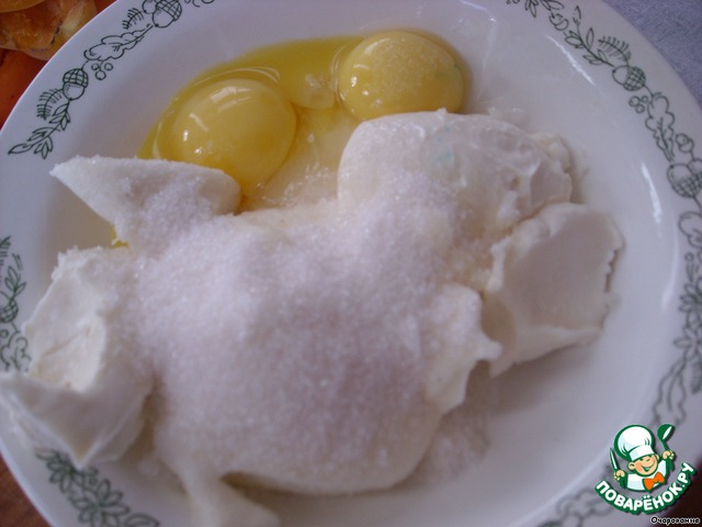 Начинка: смешать сливочный сыр с желтками, сахаром и взбить в однородную массу.