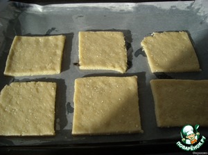 Тесто раскатать в пласт, сложить в несколько слоев и снова раскатать, так повторить 3 раза, затем разрезать на квадраты, переложить на смазанный противень.